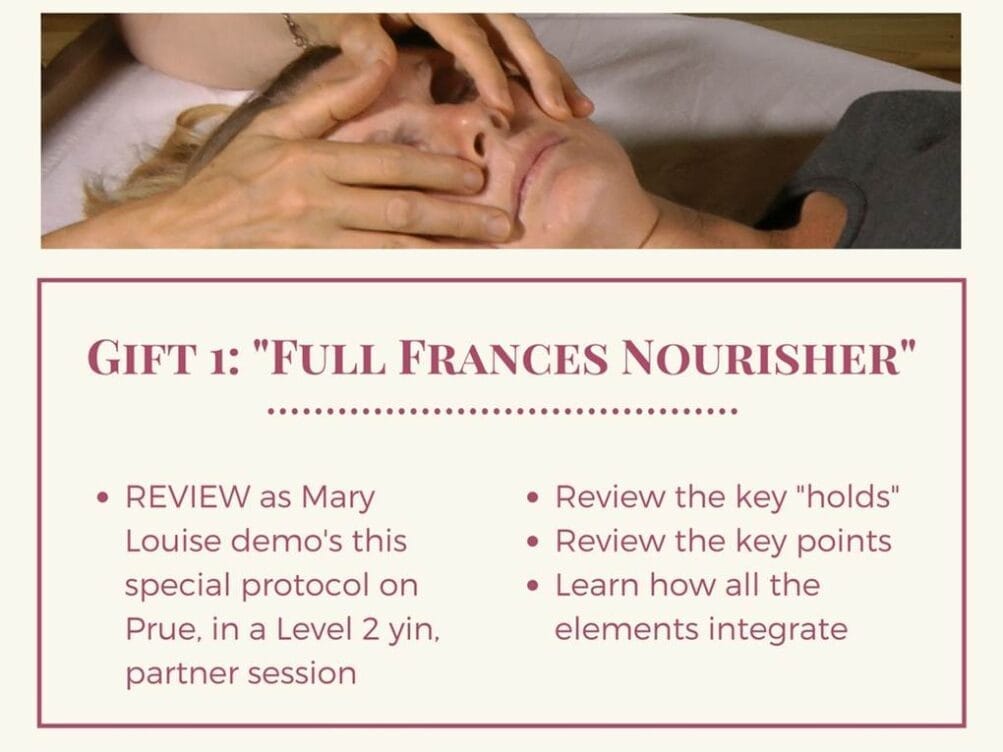 NOURISH yourself and your clients deeply with "The Full Frances Nourisher" (yin). This session encompasses everything you've learned so far. It brings everything together to create a profoundly elegant process that you can offer clients and partners.